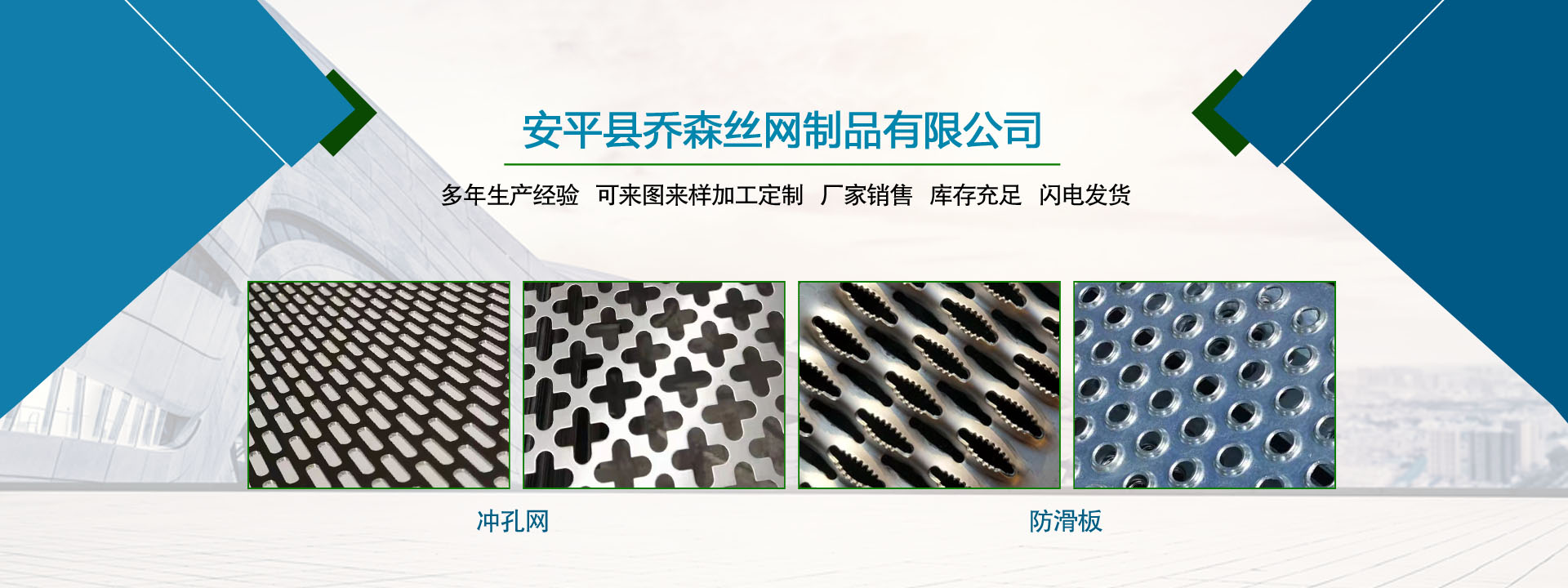 喬森絲網成立于2014年9月,位于中國絲網之鄉-河北省安平縣,是一家專注于生產金屬絲編織網、金屬網板沖孔及相關金屬裝飾絲網深加工產品的企業。從一個家庭式的小工坊到公司多年來,一直本著以“質量求生存,信譽謀發展”的生產原則兢兢業業穩步向前,贏得了 一大批忠實客戶的廣泛贊譽。然騏驥一躍,不能十步,駑馬十駕,功在不舍。我們將以更周到的服務,更過硬的質量,不忘初心,為廣大的客戶提供更優質的服務。